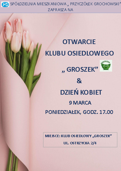 Jest nam niezmiernie miło zaprosić członków naszej Spółdzielni na otwarcie Klubu „Groszek” oraz na uczczenie Dnia Kobiet.